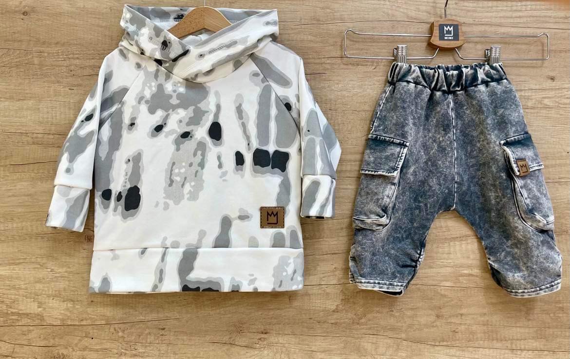 Spodnie posiadają dwie kieszenie po bokach .W pasie elastyczna i miękka gumka. Na dole nogawki śćiągacz.